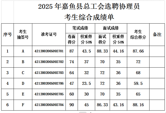 根据《嘉鱼县总工会公开招聘协理员公告》要求,第三方招聘机构于2025年9月27日组织考生笔试与面试,现将选聘人员综合成绩予以公告。详见《附表》。